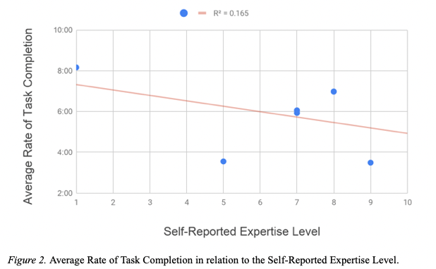 - A total of 10 participants were recruited for the usability testing. While most participants 90% were undergraduate students and 10% were graduate students. Their self-reported expertise on a scale of 1 to 10 averaged around 7.05. Given the limitations of recruiting for this project, none of the participants were in high school, thus the descriptions and conclusions can only be attributed to the representation of the participants.