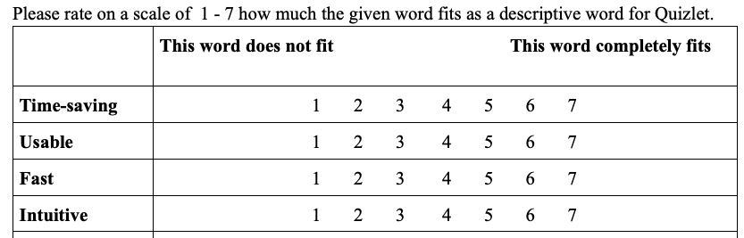 - Participants were asked to rate on a scale of 1 - 7 how much the give word fits as a descriptive word for Quizlet.